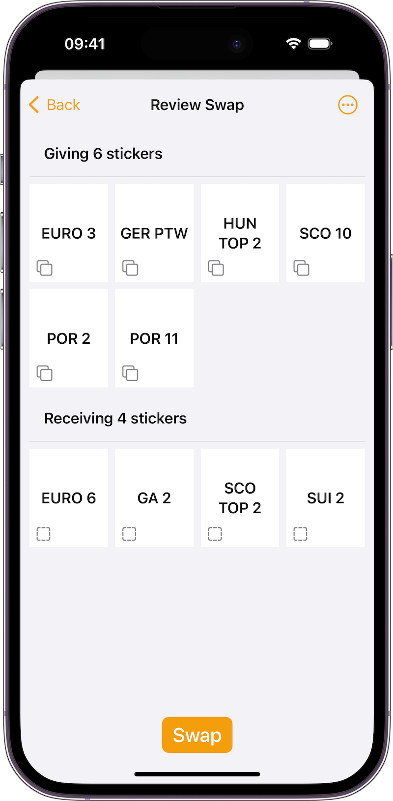 Happy you asked! When you want to swap with a user next to you, Stickers can exchange both of your missing and duplicate sticker lists via WiFi and quickly show you which stickers you can swap.